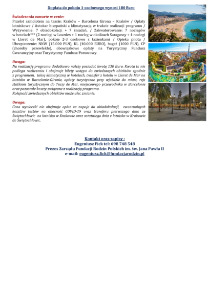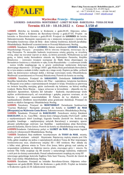 Zapraszamy na wyjazd w czasie którego będziemy mieli możliwość zwiedzenia przepięknych zakątków zachodniej Europy. W programie m.in. Sagagossa, Tossa de Mar czy Barcelona. Oprócz miejsc historycznych i pełnych kultury i sztuki, nie zabraknie czasu na modlitwę w miejscu kultu Maryjnego – Lourdes.