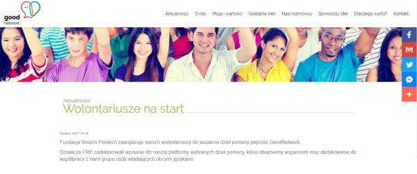Nie można było się nie włączyć! Dlatego też nasza organizacja, jako jedna z pierwszych postanowiła współtworzyć społeczność GoodNetwork otwierając się na działania w ramach wolontariatu. Chcemy w ten sposób pokazywać naszą gotowość do niesienia dobra w jak najdalsze zakątki ziemi. Wielkie wyzwanie? Oczywiście! Ale także ogromne możliwości, za które dziękujemy Fundacji GoodNetwork, która zaprosiła nas do współdziałania. Zapraszamy na stronę GoodNetwork – niech się dzieje dobro!