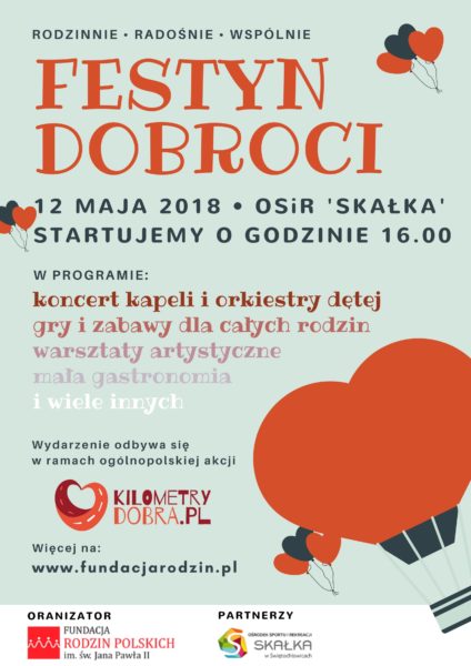 Po kilku latach przerwy organizujemy kolejny festyn familijny, czyli skierowany do całych rodzin. To było zawsze naszym głównym motorem i celem działania – umożliwić wspólne spędzanie czasu w sposób radosny, aktywny i przede wszystkim wartościowy całym pokoleniom. Tym razem zainspirowało nas do tego uczestnictwo w ogólnopolskiej akcji „Kilometry Dobra”. Jeśli ktoś nie słyszał do tej pory o inicjatywie, ani nie wie dlaczego jesteśmy jako fundacja w nią zaanagażowani, wszsytkiego dowie się z nagrania.