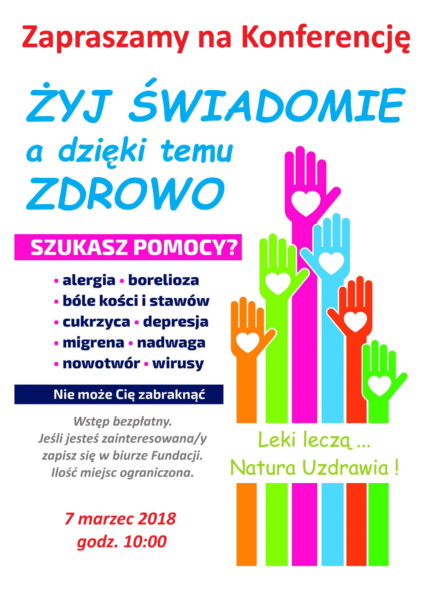 W imieniu własnym oraz organizatorów, zapraszamy gorąco na konferencję, której temat brzmi „ŻYJ ŚWIADOMIE a dzięki temu ZDROWO”. Wydarzenie jest całkowicie bezpłatne, a poruszana tematyka rozległa. Między innymi prowadzący dotkną problemu boleriozy, cukrzycy, wirusów czy alergii. Obowiązują zapisy. Szczegóły na plakacie.