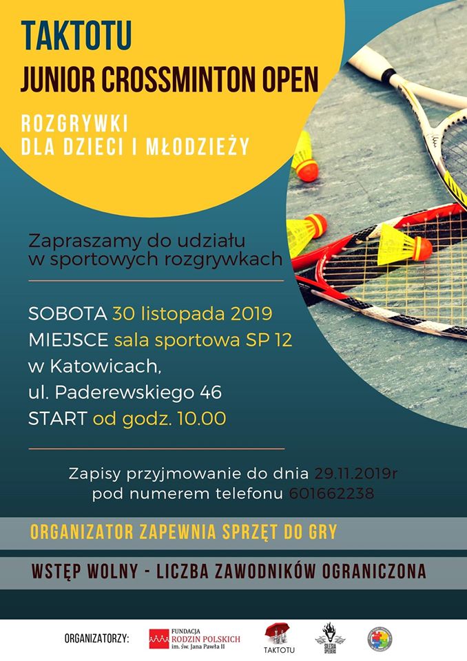 Turniej Taktotu Crossminton Open, który odbędzie się w dniu 30 listopada 2019 roku, jest pierwszym z cyklu trzech juniorskich turniejów crossmintona, które odbędą się w bieżącym roku szkolnym. Za udział i wywalczone miejsca w zawodach sportowych zawodniczki i zawodnicy otrzymają punkty, które będą zaliczane do końcowej klasyfikacji turniejowej. Turnieje będą odbywały się w sali sportowej Zespołu Szkół i Placówek Nr 1 w Katowicach przy ul. Paderewskiego 46.