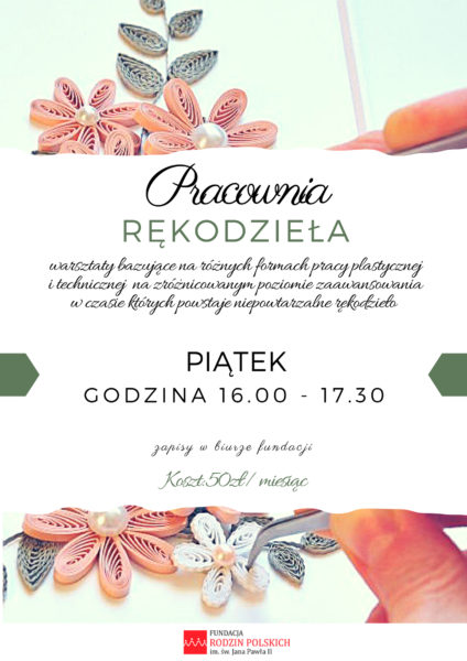 W czasie każdego warsztatu można nauczyć się czegoś ciekawego. Pod okiem instruktorów uczestnicy przez rok czasu projektują, tworzą i upiększają swoje prace, by w czerwcu wystawić je na wernisażu artystycznym organizowanym przez fundację. Od lat pracujemy z dziećmi, młodzieżą, a także dorosłymi i seniorami, a jednocześnie staramy szkolić naszą kadrę, by jakość spotkań była jak najwyższa. O tym na czym polegają poszczególne warsztaty przeczytać można w zakładce PRACOWNIE