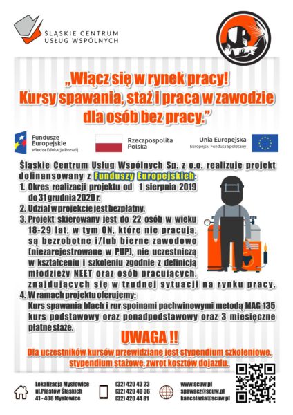 Rozpoczęliśmy rekrutację do projektu finansowanego ze środków Europejskiego Funduszu Społecznego pod nazwą „Włącz się w rynek pracy! Kursy spawania, staż i praca w zawodzie dla osób bez pracy”. Pilnie poszukujemy osób które zechciały by wziąć udział w naszym projekcie!!!!