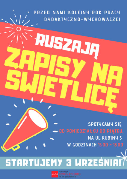 Zapraszamy serdecznie wszystkich zainteresowanych zajęciami, którzy chcą dołączyć do nas w tym roku szkolnym już w poniedziałek. Świetlica będzie działała jak poprzednio – od poniedziałku do piątku. Zajęcia rozpoczynamy o godzinie 15.00 i spędzamy razem 3 godziny na zabawie, nauce i wspólnych zajęciach. Serdecznie zapraszamy!