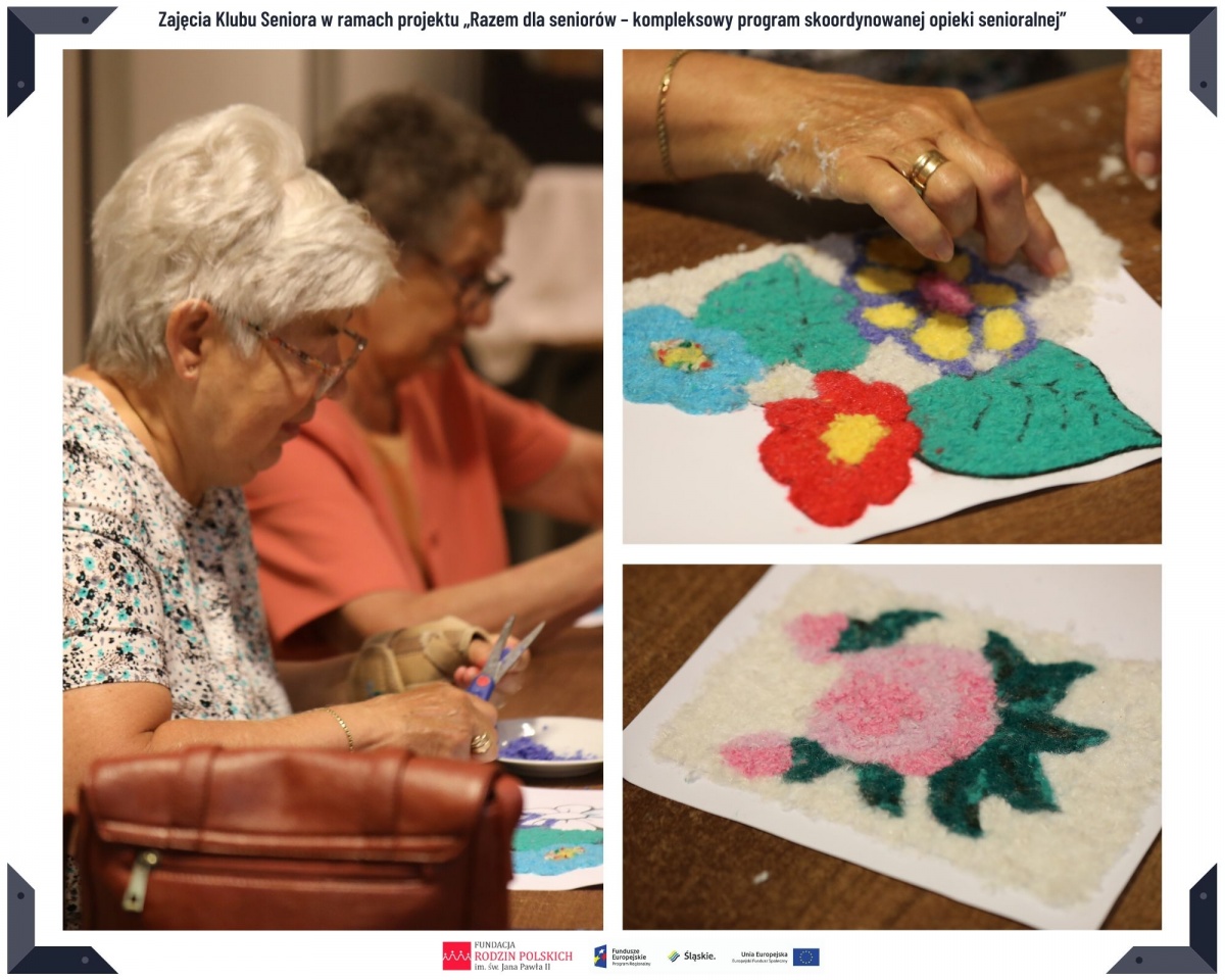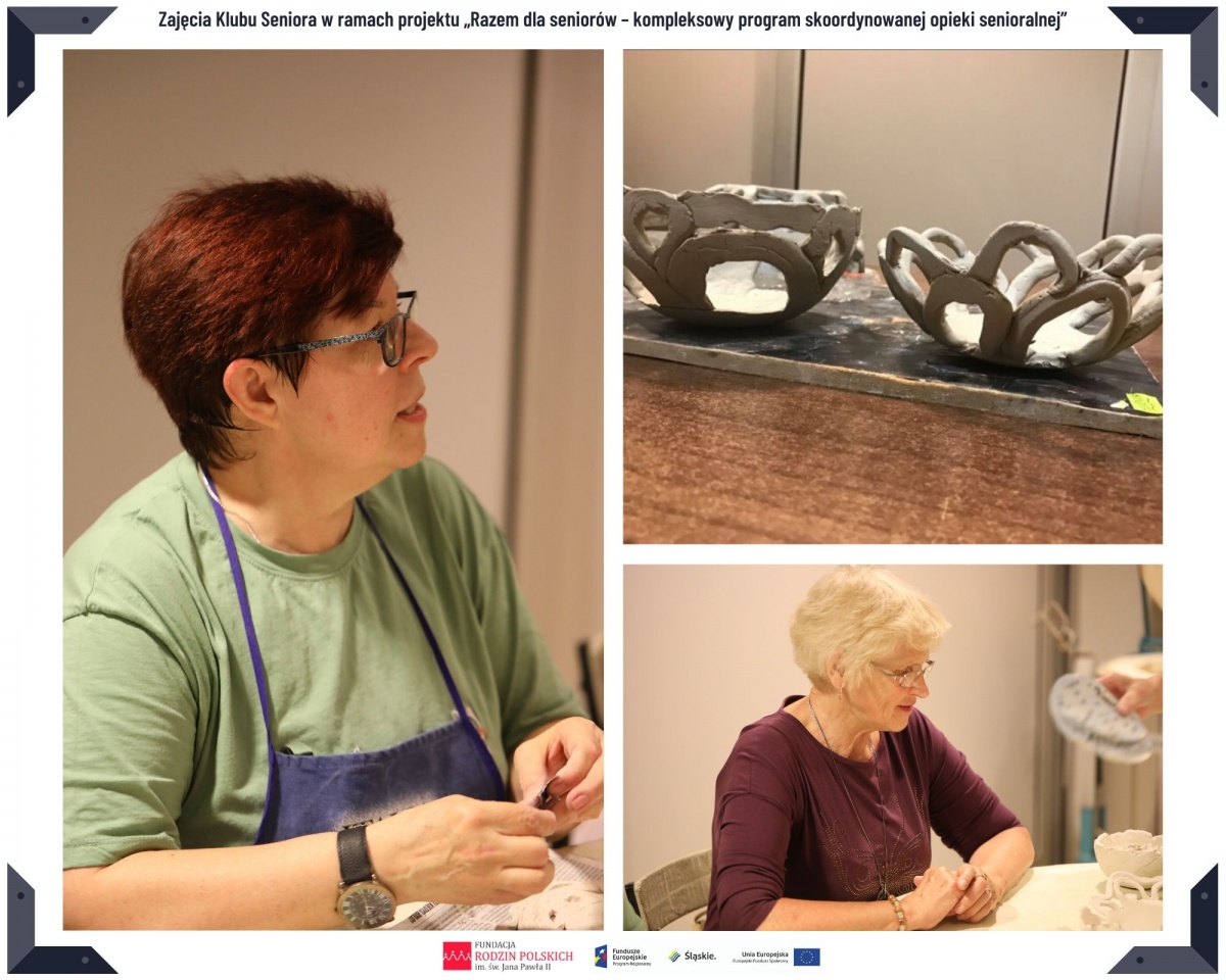 Pracownie warsztatowe jak zawsze wypełnione. Na zajęciach rękodzieła żmudna praca – tworzenie obrazków z pociętej na drobniutkie kawałeczki wełny. Pracując na wybranych przez uczestniczki szablonach, wyklejane a później malowane obrazy kwiatowe cieszyły oko. Podobnie jak oryginalne miski, lepione na zajęciach ceramiki z panią Dorotą. Tym razem nieco bardziej skomplikowane, bo przypominające ażurowe dzieła. Nie zabrakło również czegoś dla ciała – o to zadbano na zajęciach gimnastyki.